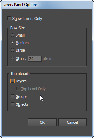 Layers Panel Options dialog with thumbnails turned off
