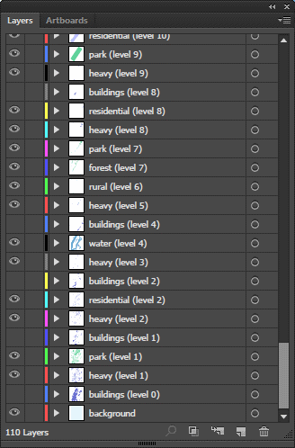 High-detailed city maps typically contain thousands (or even tens of thousands) of building polygons and these can really slow down your Illustrator. If you are not directly working on these buildings, you can turn off the whole layer by opening the Layers panel (menu command: Window -> Layers):