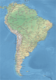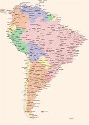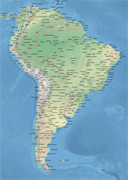 Continent-wide theme showing the physical map with shaded relief raster, country borders and major populated places