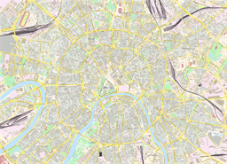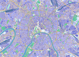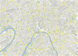 Minimalistic black and white theme showing transport network (in multiple layers) without any text labels